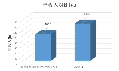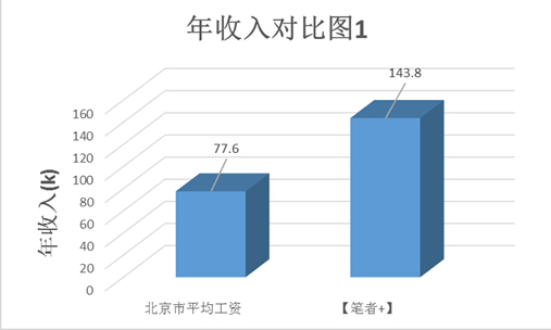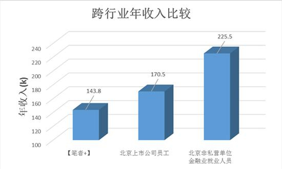 乍看上去,北京市平均工资明显低于[笔者+]的年收入,但稍作思考就会明白:前者的数据统计中,包含着大量工厂职工、环卫工人等收入水平明显更低的不具对比性的职业。在剔除了这些职业的干扰后,二者的对比如下,