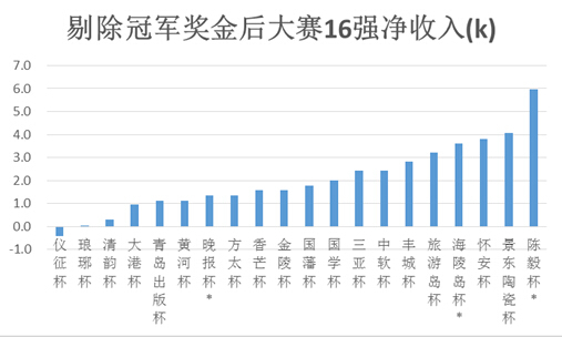 除三亚杯、中软杯和丰城杯稍显人性外,其他赛事的比赛规模和奖金规模比只能用“无情”来形容。(需要说明的是,前述三个比赛虽然奖金规模达到前50名,但如果棋手不能拿到前16甚至更高的成绩,拿到的奖金基本都不超过0.5k,这样的奖金可能用“安慰奖”来形容更为贴切。不过至少,安慰奖比其他杯赛的什么都没有奖,还是令人赞许多了)。利用上图比例和各名次对应奖金进行加权平均,笔者发现:只有当一位棋手能进入一项比赛的16强,才能基本保证收支平衡。下图为各赛扣除了食宿费(未扣除旅费)后的16强人均净收入对比,