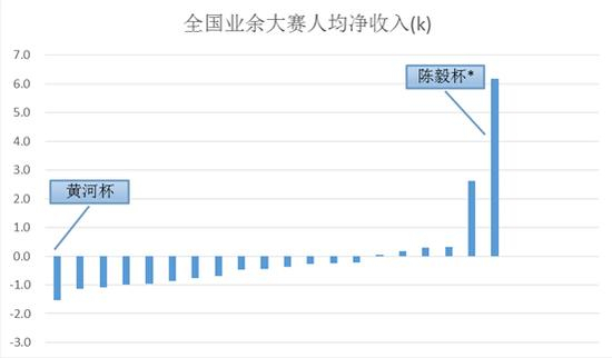 由上图可以清楚看到,在国内18项大型赛事中,仅有4项比赛的人均收入为正,其余比赛的人均收入均为负数,这意味着:在一位地方性业余高手还未具有统治级实力之前,他参加国内绝大多数业余大赛,最终都是要赔钱的。