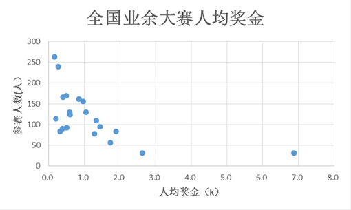 既然我们已经清楚地认识到我们报名参加全国业余大赛很有可能拿不到冠军,那么就必须对整个比赛的奖金分配进行相应的了解。除开冠军奖金,各比赛的人均奖金数目如何呢?请看下图,