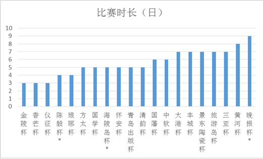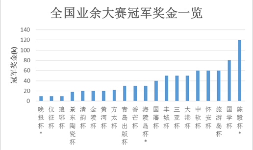 全国业余比赛琳琅满目大小不一,但奖金真正能达到养活参赛棋手标准的,却是寥寥。在本文的研究中,笔者收集了2014年全国30多个业余围棋比赛的相关数据,并以[冠军奖金]、[比赛规模]、[申报业余6段数]和[是否计入全国业余围棋等级分]等重要指标为临界标准,最终选出了包括晚报杯、黄河杯此类传统赛事和陈毅杯、丰城杯这些今年出现但影响力甚广的新兴赛事在内的共20项全国性业余大赛作为参与本文研究讨论的主要数据。