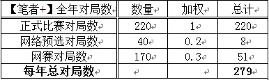 - 加权一栏为对局重要程度和专注程度的衡量标准。正式比赛对局最重要,权重为1,与国内其他组织的统计标准一致;网赛涉及高额奖金,重要性和专注性次之,保守估计权重0.3;网络预选对局相对最不重要,保守估计权重0.2 。