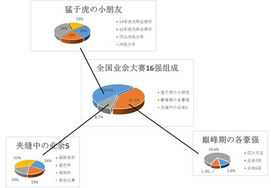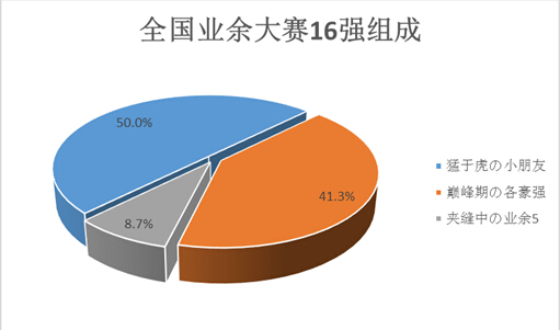 最后,请跟随笔者将目光转向饼图中狭窄到无所适从的业余5段部分。笔者一直认为,一名业余5段棋手能拿到全国性业余大赛的16强,已经是上苍对其最大的褒奖。已经惨淡经营的8.7%并不是这个残酷现实的全部——在这本就寒酸至极的8.7%中,还有超过八成的数据来自具有显著地区限制和年龄限制的香芒杯、琅琊杯和海陵岛杯。