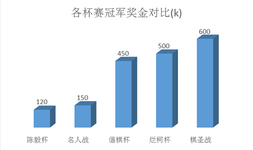 由上图可以看出,这20项比赛规模不一,冠军奖金从10k至120k不等。以其中冠军奖金最高的陈毅杯为例,笔者将其和同年职业棋界中具有代表性的几项大赛进行一个简单的比较。如下图,