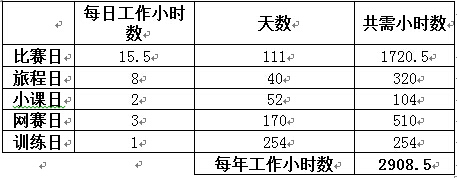- 有大赛参赛经历的读者应该会了解业余比赛的日程安排。笔者按目前公认最宽松的赛制安排方法进行计算——每日3盘棋;每盘棋双方1小时15分,加上各轮次间间隔的半小时,共计3小时;对局状态极为紧张激烈,远超世界公认的工作小时数统计标准,按1.5倍计算;为保持竞技状态,比赛日每晚有2小时的记谱、复盘、研究时间;因此比赛日每日工作小时数=3*3*1.5+0.5+2 =15.5小时。比赛天数则由前文的统计数据得出。