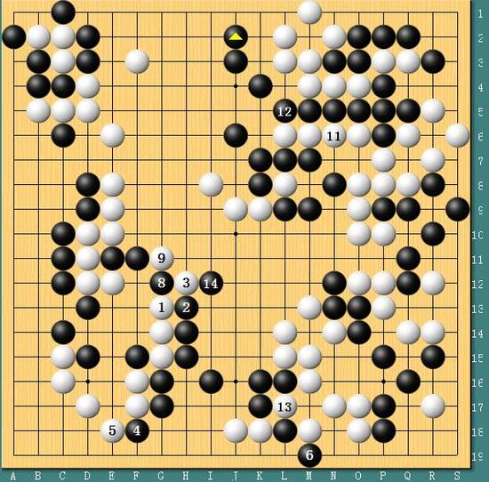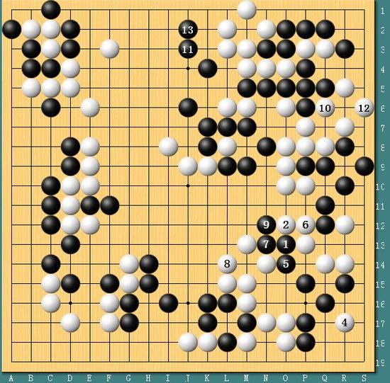图二,一力辽先失误。黑1位靠是严重失误,应该直接靠在O11位,那样白棋可能直接崩盘。实战中范蕴若劫材得到缓解,直接12位解消劫争形成转换,局势直接逆转。