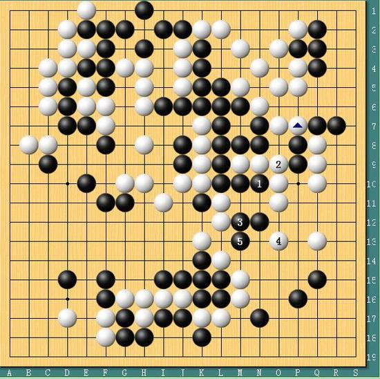 图四,常规选择。局部时越有一个比较简明的变化,1位挤吃然后3位双,这样白4跳的分断手段就明显不成立了。不过实战时越没有选择这个常规手段,时越赛后表示,当时自己已经读秒,担心对方M14位接,那样虽然靠一下也有可能活,但并没有把握。