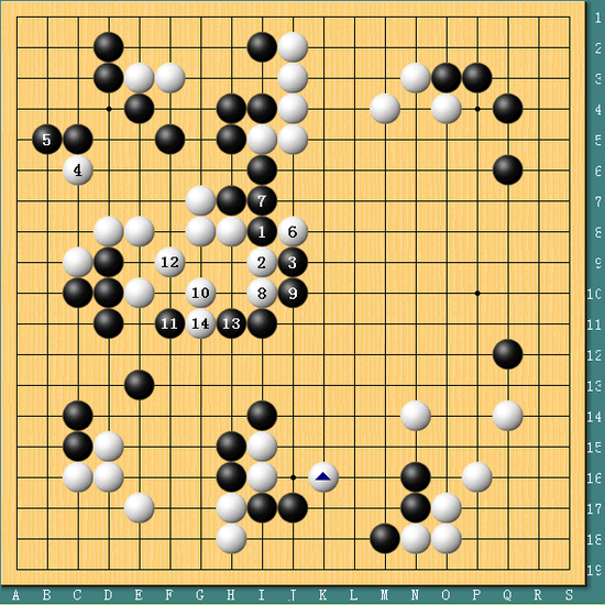 图二,朴永训果断反击。朴永训1位脱先逼住下边,黑2与白3交换后在4位压,这手棋有些随手,实战遭到朴永训5位扳出的严厉反击,柯洁征子不利,黑4这手弃与不弃骑虎难下。至白11跳时,黑棋下边已经不好应了。