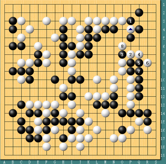 图三,河野临简明优势。左下角古力1位飞遭河野临2位跨断,此后变成古力单方面治孤。河野临并未发动猛攻,而是浅尝辄止,放白棋连回。但即便这样,黑棋仍然是简明优势的局面。