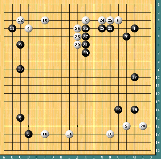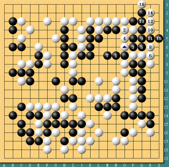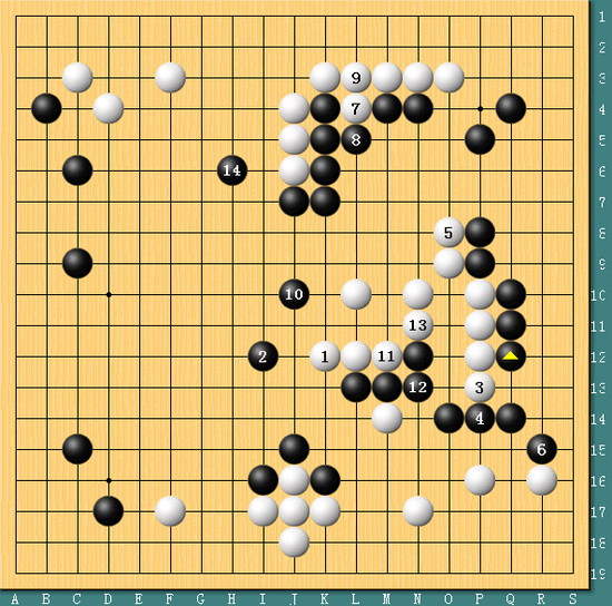 图二,被动延续。实战中古力尝试压缩右边黑棋模样,但效果一般,白棋中腹多出来的孤棋被黑棋2-10连续攻击,落下后手做活。河野临在14位相当于外面连下3手,黑棋局面生动,白棋大局明显落后。