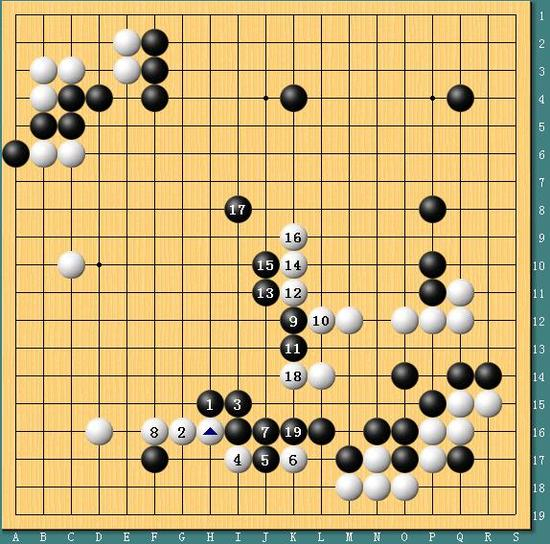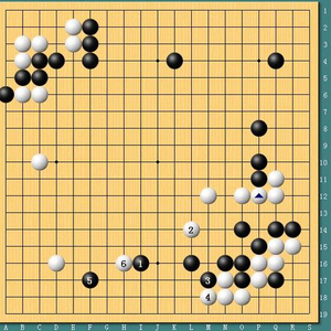 图一,柯洁执白VS时越。序盘下方定型,时越1位大跳形状有些脱节,柯洁2位小飞威胁着局部黑棋弱点。时越黑3虎后局部还欠一手,但再补又不甘心被利用。实战时越索性5位脱先,但遭到柯洁6位靠的反击强手。