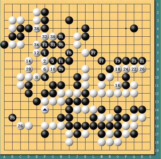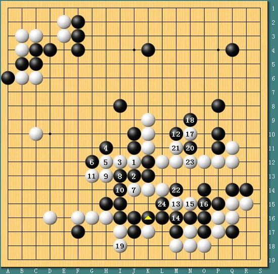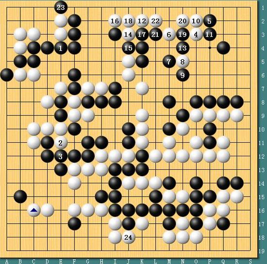 图五,柯洁超强治孤。实战中时越1位粘补住左上角的弱点,柯洁随即4位打入右上黑阵,并展现出超强的治孤能力,由于周边被借用的地方很多,时越在攻击中无从发力,最终只能眼看着柯洁在黑阵中做活。虽然黑23位扳左上角有打劫杀的手段,但是此时柯洁已经判断清了形势,简单收官便可确保胜利。最终柯洁200手中盘胜出。