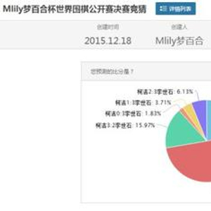 梦百合杯决赛竞猜活动自12月22日推出后,得到网友极大热情的参与,短短几天就有近万人参与竞猜,近千人留言互动。截止至12月26日,共有21.70%的网友支持柯洁3比0取胜,50.66%的网友支持柯洁3比1取胜,15.97%的网友支持柯洁3比2取胜。也就是说,共有88.37%的网友认为柯洁将最终夺冠。竞猜活动仍在进行中,竞猜截止至29日23点59分。