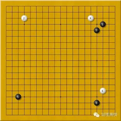 图七是新布局时期新旧对抗的代表,白6、10、12都是挂角、缔角先行,黑11、13则直接张边连片。
