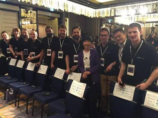 我比较迟钝,等反应过来,我所在的第一排就剩我一个人了。我也站起身来,一回头,咦,第二排整整齐齐坐着的帅哥们穿着同样的制服,不正是DeepMind的团队吗?也不知道哪里来的勇气,我又坐下来,向他们说,Hi,我从中国来。和他们坐在同一排的樊麾立刻过来向他们介绍了我。于是我们聊了起来。他们说他们这个团队都是从英国来来的,明天回去。我说,AphaGo赢了李世石,我很难过。但我还是觉得你们了不起,创造出了这么出色的程序,You did great job! 他们微笑着说谢谢。然后告诉我,一年前,AphaGo还赢不了别的围棋程序。我问,但是这次来之前,是不是你们已经知道了能赢,他们没有正面回答,只是说,我们做了很多测试。。。我又问,第四局发生了什么事。他们说,我们也不清楚,要回去好好研究。还说,所以我们需要(向空无一人的台上指指)李世石这样了不起的棋手来和AphaGo对局。我说,有一种说法,说是你们换了一种程序,比较低的一个版本来下第四局。他们很认真地答,没有!这是不能的,如果这样做,是对你们的不尊重。我赶快谢了他们,说我很高兴听到你们这么说。聊着,我突然想追追这群帅小伙儿的星,就问,我能和你们一起合影吗?答当然可以啊!樊麾自告奋勇帮我们拍照。就在这时,呼啦啦一大堆记者涌来拍我们,这样樊麾也可以解放出来,加入我们合影的阵容。对着镜头微笑时,我想,真的是铸久说的对,什么人机大战,是人人大战才对啊!是这些帅气,有礼,高智商的出色人才组成的团队,和我们职业棋界的杰出代表李世石的对抗,也是他们携手共同谱写的一曲围棋之歌……我的心情突然开朗起来了。
