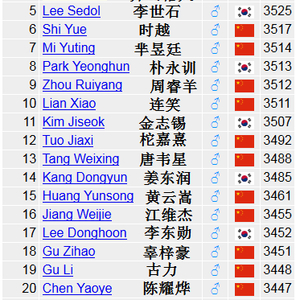 排名前二十的棋手,依次为: