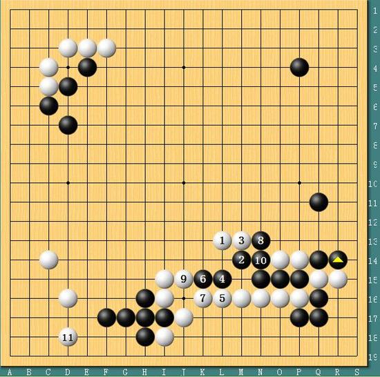 图二,李世石的恐吓朴廷桓不为所动。李世石1-5在中腹连花两手棋加厚,同时压缩右边黑棋成空潜力。此外还威胁着左下方黑棋的安危。不过朴廷桓完全不为所动,在4-6连花两手吃掉上边白棋2子。李世石只好进攻黑棋。然而李世石没有想到的是,白9碰的时候朴廷桓竟然选择10位扳反击,这似乎令李世石有些愤怒,白11直接断了上去,但是作战却并非对白棋有利。