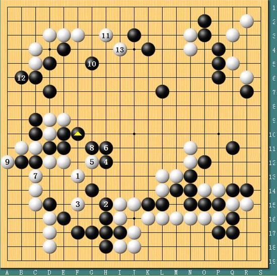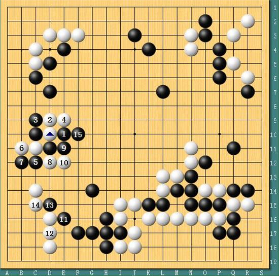 图四,大势已去!实战中李世石根本对下边黑棋无可奈何,仅仅吃回左边2子。但是要知道的是,白棋为了这一波进攻付出了上边的代价,整体算下来李世石亏损太过严重。棋局下到黑棋12位立时,李世石已经大势已去。虽然后半盘李世石顽强地将差距缩小到3点,但和胜负已经毫无关系。