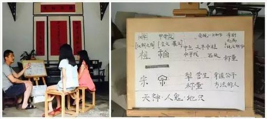 我们在堂屋,在家里祖先的牌位面前我教她甲骨文的“祖宗”两个字,解释“祖宗”的含义,李嫣现在也认识相当数量的甲骨文。