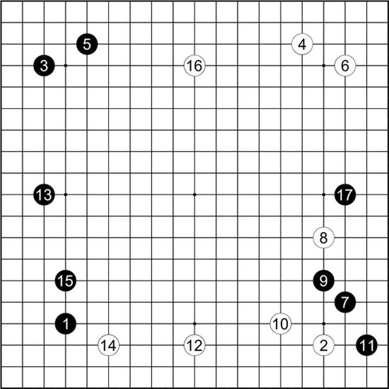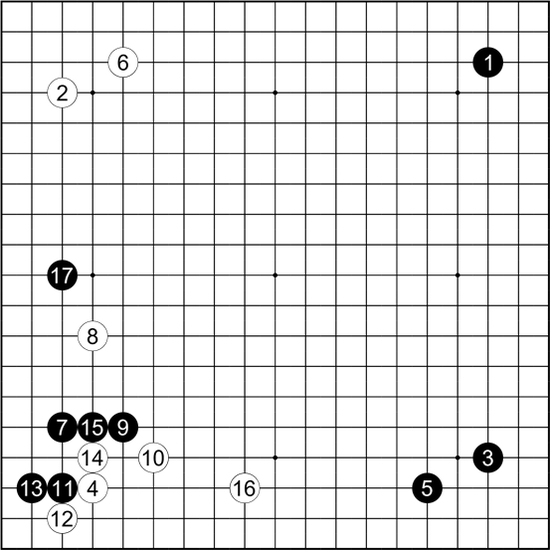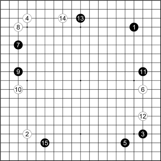黑再度祭出了1-5的布局。白想到的对策,是选择了4目外,6守无忧角的下法。