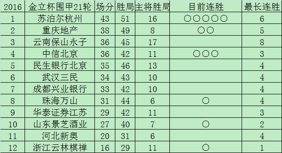 北京时间12月1日,2016金立手机杯中国围棋甲级联赛第21轮在重庆丰都鬼城战罢。朴廷桓击败党毅飞,帮助卫冕冠军苏泊尔杭州队4-0横扫成都兴业银行,提前一轮蝉联联赛冠军。重庆队击败民生银行,排名上升至第二名。金志锡击败柯洁,浙江虽然3-1胜云南,但仍提前1轮降级。