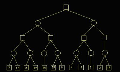 图为搜索树示例,方块和圆圈是两个对手,每一条线代表下出一招。局面评估后,棋手要遵守MIN-MAX的原则,要“诚实”地认为对手能下出最强应对再去想 自己的招。有局面评估分数的叶子节点其实不用都搜索到,因为理论上有剪枝算法证明不用搜索了。如一下被人吃掉一个大子,又得不到补偿的分枝就不用继续往下 推了。这些搜索技术发展到很复杂了,但都属于传统的搜索技术,是人可以信服的逻辑。