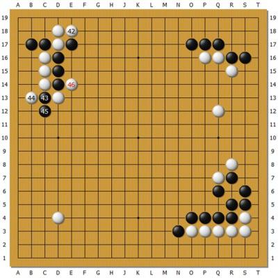 上图为Master执白对芈昱廷,左上角的大雪崩外拐定式,白下出新手。白44职业棋手都是走在E13长的,后续变化很复杂。但是Master却先44打 一下,下了让所有人都感到震惊的46扳,在这个古老的定式下出了从未见过的新手。这个新手让芈昱廷短时间内应错了,吃了大亏。后来芈昱廷自战回顾时说应该可以比实战下得好些,黑棋能够厚实很多,但也难说占优。但是对白46这招还没有完全接受。这个局面很复杂,有多个要点,Master的搜索中是完全没有定 式的概念的。