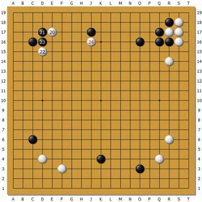 上图为Master执白对陈耀烨。在黑子力占优的左上方,白20挂入,黑21尖顶夺白根据地意图整体攻击,白22飞灵活转身是常型,23团准备切断白,这 时Master忽然在24位靠黑一子。Master比起之前的版本V18,感觉行棋要积极一些,对人类棋手的考验也更多。可以想见这里黑内扳外扳两边长脱 先各种应法很多,并不是很容易判断。