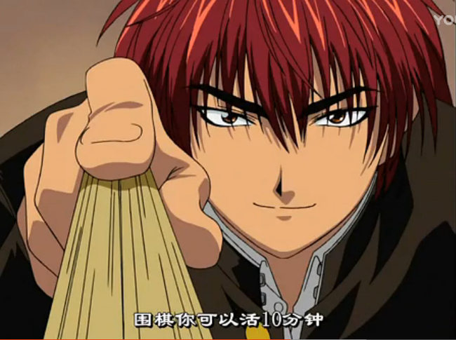 对局未开始前,加贺的对手看到了加贺扇子上写了个“将”字,知道加贺是象棋社的人却来参加围棋比赛便冷嘲热讽,被激怒的加贺霸气放话:“象棋的话你活不过5分钟,围棋你可以活10分钟”。最后加贺真的只用了10分钟便战胜了对手,对此笔者表示加贺帅呆了,对于不懂得尊重别人的人,最好的办法就是用实力让他闭嘴。
