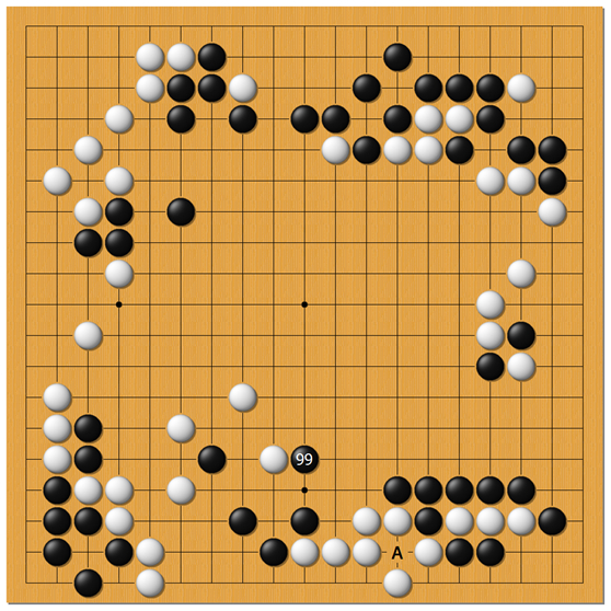 当黑99靠出时,假设白棋下在A位,最终白棋还能赢吗?