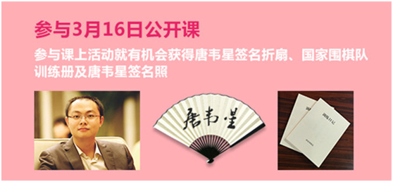 3月16日晚19:30,围棋冠军免费公开课将在爱棋道(iqidao.com)及新浪棋牌同时进行,唐韦星九段将与雷雯6段进行直播授课。