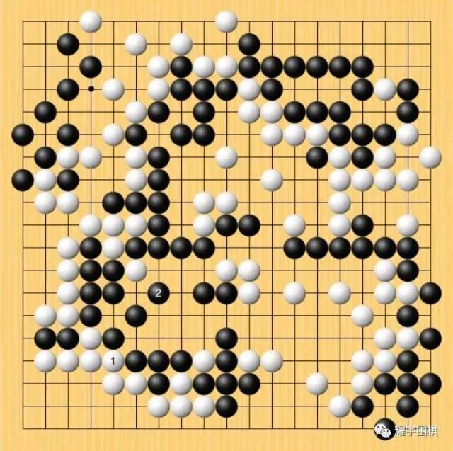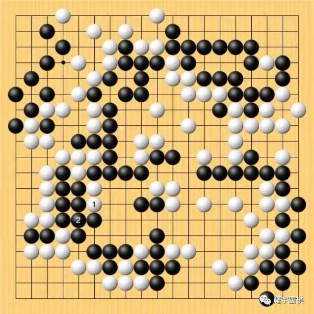 图1: 棋局进行到此,是白稍优的局势。Zen无缘无故白1先手叫吃与黑2交换,这看似不经意的交换,首先无谓的浪费了一枚宝贵的劫才,更要命的是,白棋很有可能白白损失1目棋!请看下图: