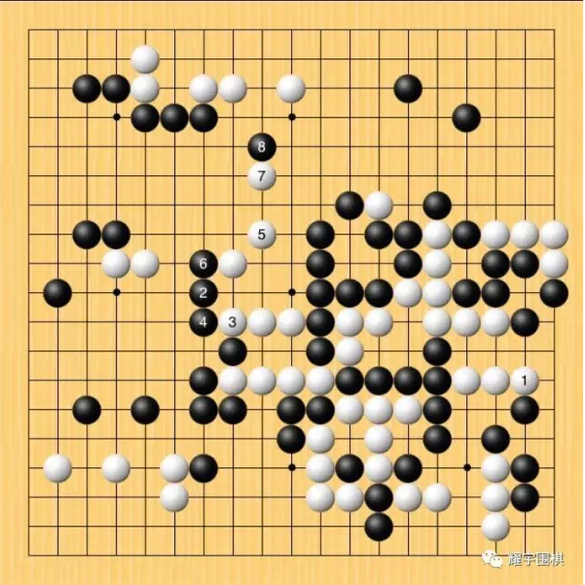 图2:一力辽这时候已经进入读秒,无暇细想,他一看,绝艺右下大块居然不补了?那赶紧白1补一刀先将黑右下数子收入囊中再说。可绝艺黑2是好棋,非常严厉!至黑8,左边白两子已经被黑棋鲸吞,损失惨重!而且中央白大块归路也被切断,只好跟右下黑大块对杀。后来的结局大家也都看到了,一力辽虽然杀掉了绝艺右下大块,但为此付出了巨大的代价,最后得不偿失大败而归。