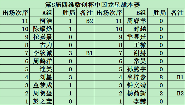 第8届四维数创杯中国龙星战由中国围棋协会主办,株式会社围棋将棋频道协办,赞助商四维数创(北京)科技有限公司是中国四维测绘技术总公司下属四维航空遥感有限公司与民营资本共同投资建立的一家混合所有制企业,是四维集团面向政府和企业客户提供空间地理信息服务、云计算平台、大数据中心建设与智慧应用高新技术企业,国内最早进行地理信息云计算平台研究的企业之一。龙星战本赛22人分为AB两组,由最下一名逐级向上挑战,每组最多胜与擂主进入半决赛交叉对决。用时30秒1步,保留10次1分钟读秒,冠军奖金20万,亚军8万人民币。4月29日还将进行第2期龙星战中日冠军对抗赛,由上届冠军芈昱廷对阵一力辽,首届冠军对抗赛柁嘉熹胜结城聪。