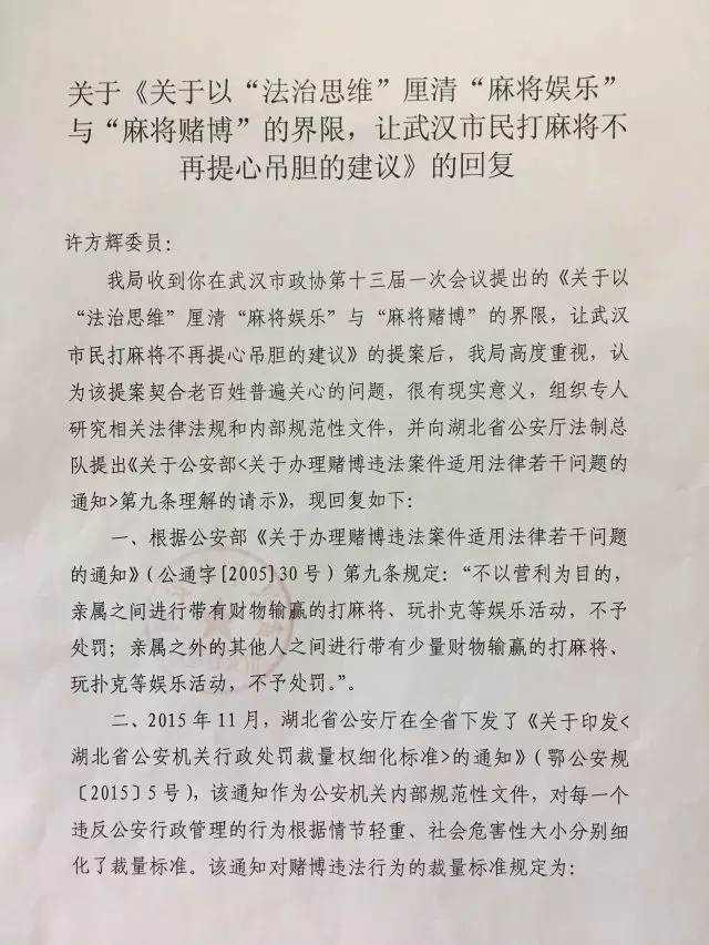 5月17日,全国首例“麻将政协提案”获武汉市公安局治安管理局回复。
