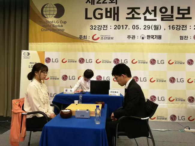 另一盘性别大战在崔精与伊田笃史之间进行。去年崔精连胜王元均、黄宰渊、安国铉、周贺玺、范蕴若。今年LG预选崔精连胜柳秀沆、玉得真、金美里、崔宰荣4位韩国棋手再度昂首出线。而伊田笃史在前年三星杯曾战胜过崔精。本局崔精乏力过猛屠龙未果,此后自己大块被迫两眼苦活,最终败下阵来。