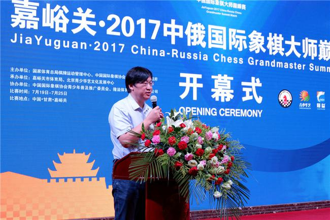 嘉峪关市政府市长丁巨胜在致辞中说到:“中俄国象大师巅峰赛是通过政府搭台,市场运作,邀请两国顶尖大师参与的重大体育赛事之一,对巩固中俄两国人民有好关系,增强两国体育文化交流,推动丝绸之路经济带建设具有十分重要的意义,我们将以本次巅峰大师赛为契机和起点深化国际象棋培训、普及、人才培养等工作,开展国际象棋之乡,国际象棋推广,促进体育事业体育产业的蓬勃发展,加快建设甘肃休闲运动型城市。真正使赛事成为增进交流,深化合作,推动发展的盛会。”