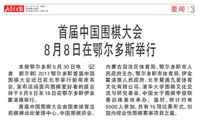 庆祝自治区成立70周年,由国家体育总局棋牌运动管理中心、中国围棋协会、内蒙古自治区体育局、鄂尔多斯市人民政府共同主办的“2017鄂尔多斯首届中国围棋大会”将于8月8日至18日在伊金霍洛旗隆重举行。