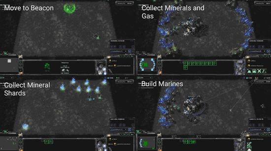 为了探索神经网络自学习框架对星际争霸的作用,Deepmind还设计了七个迷你游戏,等于是相当于Atari小游戏难度的子任务。这七个迷你游戏跑出了一些有意义的结果。