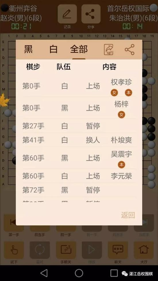 比赛首先上场的是队伍双方的女棋手:权孝珍六段和杨梓二段。比赛开始没多久,局势就开始便得紧张,白棋时间落后,至第27手,终于使用了第一次暂停。