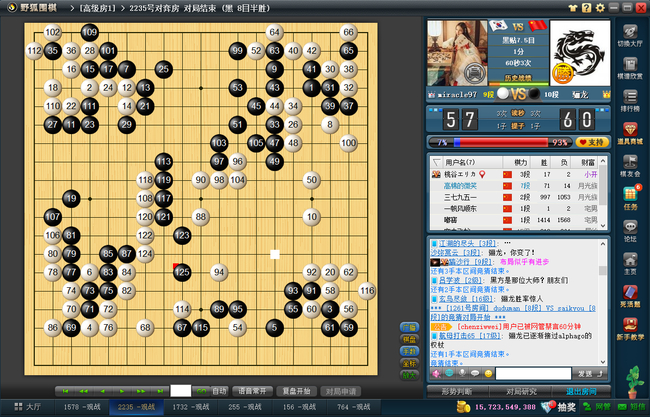 随后,韩国新锐miracle97(卞相壹六段)递上战书。本局执白的卞小胖同样布下二间跳守角,并在左上角先后脱先四手,态度颇为积极。然而棋局进程却与上一局惊人相似,骊龙先是顺水推舟将左上围成铁桶,几番定型后又是一片滔天模样围成。卞六段同样花费两手棋侵消黑势,但也仅仅只能阻碍其发展,无法伤及根本。随后白棋的拼搏不可谓不顽强,但黑棋只是简单搜刮,逼迫白棋单官连回,便轻松将盘面15目以上的优势留到终局。