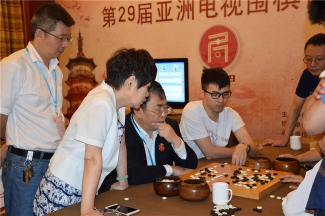 上午,聂卫平来到研究室关注对局。王汝南和华学明自开赛一直在研究室督战,虽然中国棋手无缘晋级,但是中国棋手依然一直在研究室内关注赛事进程。下午14:30聂卫平将与徐莹搭档进行大盘讲解,央视将进行直播。