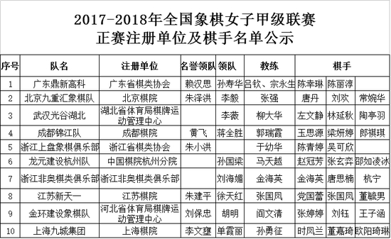 赛事共有十支女子队伍广东鼎新高科象棋队(陈幸琳、陈丽淳),北京九重汇象棋队(唐丹、刘欢、常婉华),湖北武汉光谷象棋队(左文静、林延秋、陶亭羽),成都锦江象棋队(玉思源、梁妍婷、郎祺琪),浙江上盘象棋俱乐部队(陈青婷、吴可欣),龙元建设杭州象棋队(赵冠芳、张玄弈、邵如凌冰),浙江非奥棋类俱乐部队(金海英、唐思楠、杭宁),江苏新天一象棋队(党国蕾、张国凤、董毓男),金环建设象棋队(张婷婷、刘钰、王子涵),上海九城集团象棋队(时凤兰、董嘉琦、欧阳琦琳)参加。比赛分为两个阶段赛会制,第一阶段10月17日-23日,第二阶段既定在2018年的四月展开。