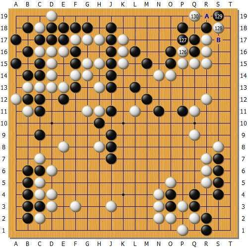 白130。 官子同样滴水不漏。(黑只能在A位接。若在B位吃,白O17即可出棋。白棋点完以后,T17有先手味道。)