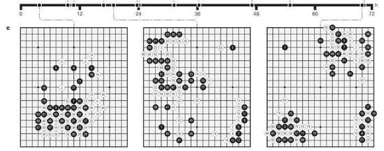 看AlphaGo学会的定式,更是有趣。A行是AlphaGo在训练过程中学会的人类定式。B行则是在训练的不同阶段,AlphaGo最喜欢的定式。