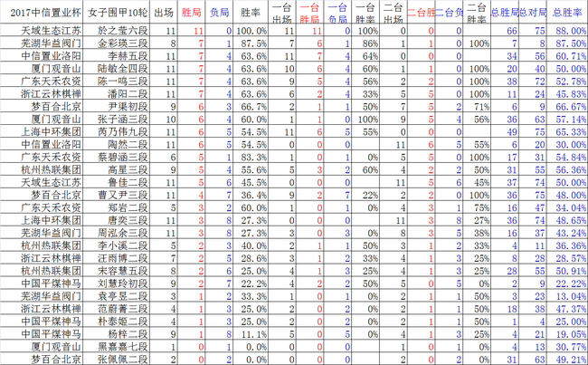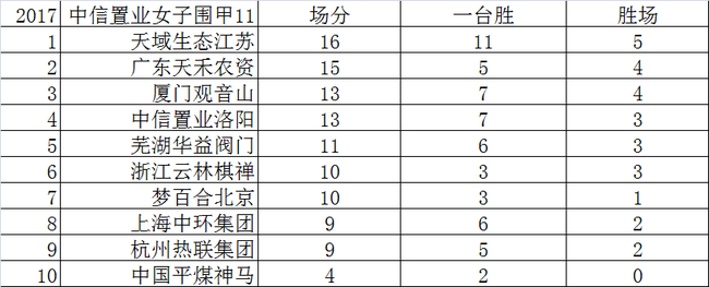 本轮战罢,江苏积16分、广东积15分领跑,厦门、洛阳同积13分,芜湖11分,浙江、北京同积10分,上海、杭州同积9分,平煤积4分垫底。女子围甲联赛12轮后天继续在各队主场进行(主队在前):芜湖-浙江 平煤-江苏 洛阳-杭州(北京) 广东-北京 上海-厦门(克拉玛依)。