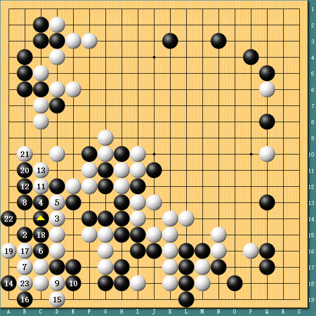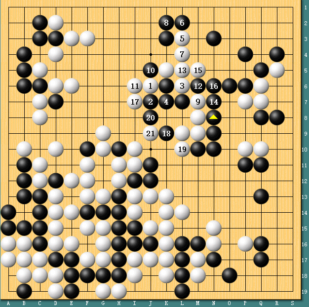 面对白方犀利的招法,黑只能选择强硬抵抗展开最后拼搏,无奈自身不厚,被白棋抓住味道完美利用。实战不仅白棋逸出,中腹数子竟被白反噬,最后白21卡入堪称妙筋!自此万事皆休!