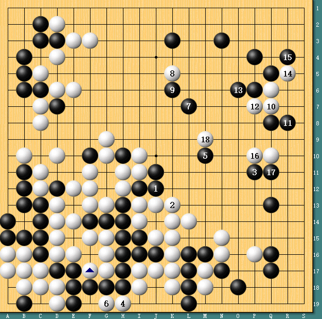 面对下方打入的黑子,辜梓豪施展了连环的狙击手段,白1打入,待黑2尖出后又从右边寻找头绪,一队子从容弃掉后再贴下去,白13一跳,强硬将黑棋分割开来,依仗白左边厚势开始对黑展开猛烈的袭击,这里辜梓豪眼界之大,算路之深,其卓越的天份真可窥之一斑。