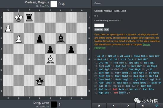 北京时间2017年11月14日早晨,在美国圣路易斯举行的中国棋王丁立人与世界棋王卡尔森之间的8局10分钟包干快棋赛结束,丁立人以一胜一平六负再败于棋王(丁立人在有的对局中并不落下风,但因超时告负;除了包干制快棋差距明显以外,严重的时差影响也是导致丁立人输棋多的重要因素)。不过,在首局较量中丁立人执黑发挥完美,实现了战胜棋王卡尔森的零的突破!可喜可贺!当然,更要祝贺棋王卡尔森,他以极其强势的表现,刷新了自己保持的国际象棋超快棋等级分世界纪录,将原纪录2948分提升至目前的2982分!(当然,很可能明天纪录还会被刷新)