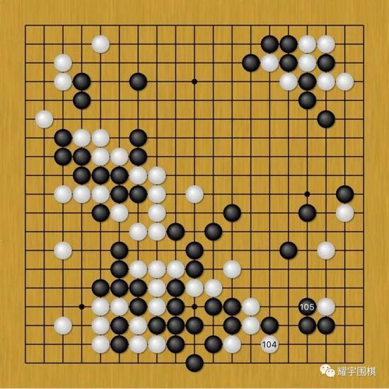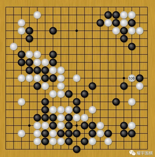 图7:白106!是柯洁真正后悔的一手棋!如果说之前白104挑起战争是在他的控制范围之内,那白106则过分了!就是这步棋,导致了柯洁对右下战局失去了控制,陷入“战争泥潭”,越陷越深……